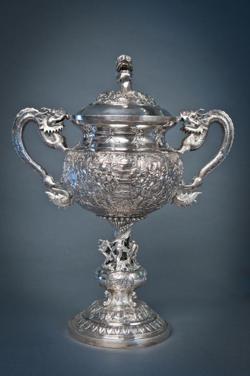 Detail from the lid of a large silver cup 'presented to 1st Inniskillings by the European residents in Tientsin, China for their good service during the disturbances 1909 – 1912'.
