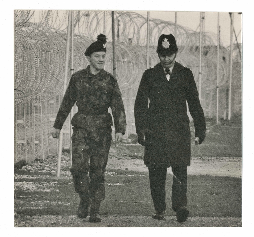 For some four weeks in January 1981, and taking it in turn for one week each, first B and then A Company 2nd Battalion The Royal Irish Rangers, with under command a Royal Navy medical team, a Royal Military Police detachment, a Royal Air Force Security detachment (guard dogs) and a contingent of the Wiltshire Constabulary took on the task of guarding HMP Rollestone. Rangers manned raised sentry boxes, the guard room, perimeter security gates, interface gates to prisoners billets, the operations room and the quick reaction force.