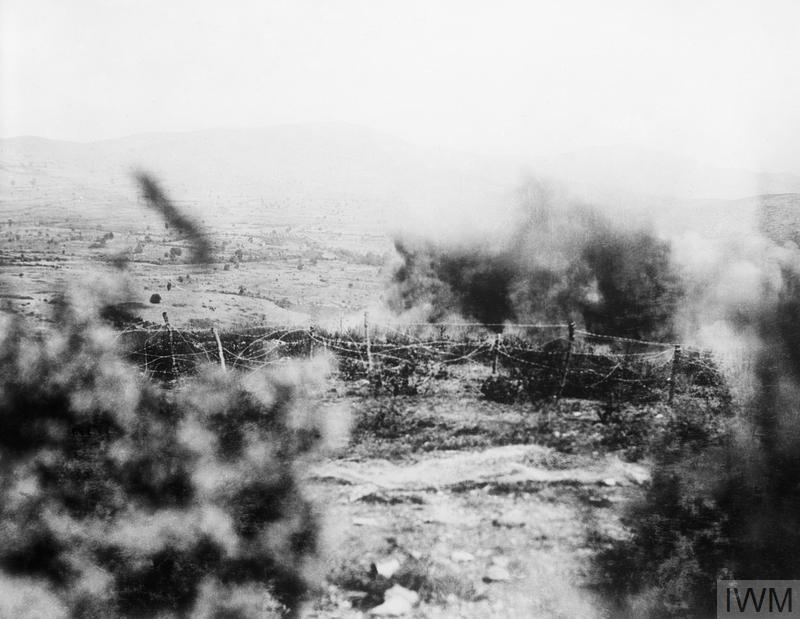 | Bulgarian artillery shells bursting close to British positions near Doiran in Macedonia, August 1916. |