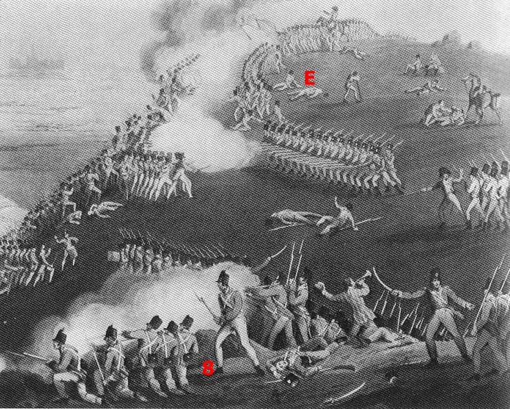After various engagements, Murray’s army fell back to Castalla. Here, Marshal Louis Suchet’s army deployed in order of battle on the morning of 13 April 1813, and in three divisions attacked the left of Murray’s lines. Suchet personally selected a column of French Grenadiers to attack the very point where the 2/27th were deployed. It was there that a most unusual event took place. As the French column was deploying, one of their Grenadier officers advanced alone and challenged any 'English' officer to single combat. Captain John Waldron, ‘an agile Irishman of boiling courage’ of the 2/27th, advanced towards the French officer and accepted the duel. Their swords clashed as both sides looked on without firing a shot. Waldron downed his French opponent in the opening blows, whereupon the 2/27th rose as one from the ground and, with a mighty roar, bayonet-charged their opponents, scattering them down the hillside.