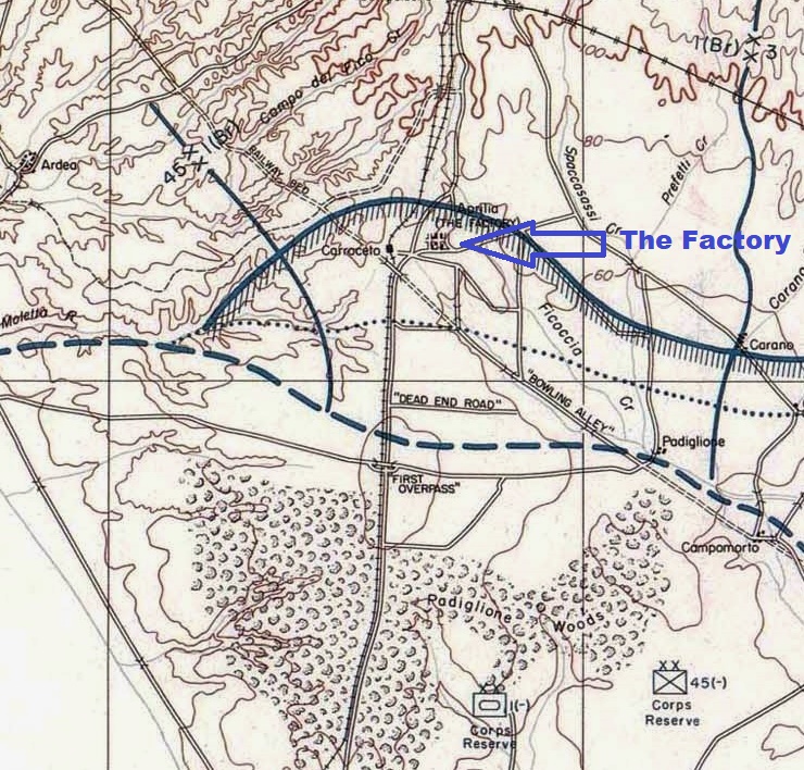 Perimeter as at 5 Feb 44; note Carroceto, Aprilia and 'The Factory'.