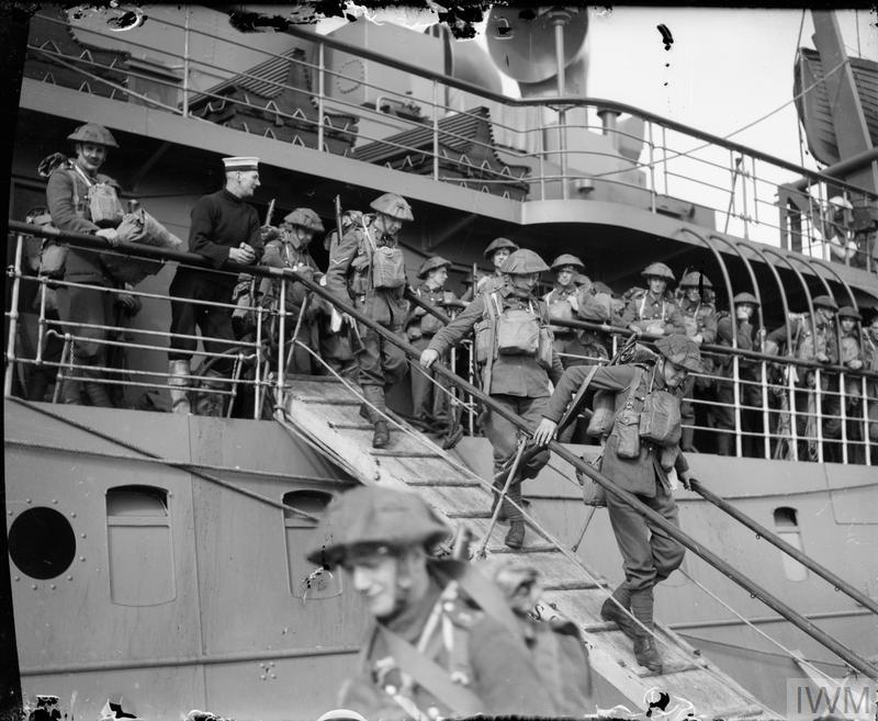 Right, elements of the 2nd Battalion The Royal Inniskilling Fusiliers disembarking at Cherbourg from the SS Royal Sovereign (possibly D Company and HQ Company). The majority of the Battalion crossed from Southampton on the SS Manxman before departing Cherbourg harbour at 1446 hours. By 18 September, the Battalion was complete but with some shortages in manpower and equipment.