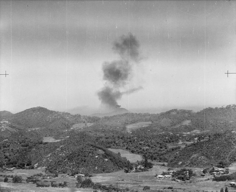 | A view of Maryang San (Hill 317), after British bombardment with Napalm and rockets during Operation COMMANDO.© IWM (BF 10430) |