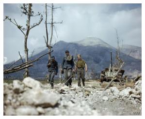 | Three German prisoners walking back through the Allied lines at Cassino in Italy, May 1944 |
