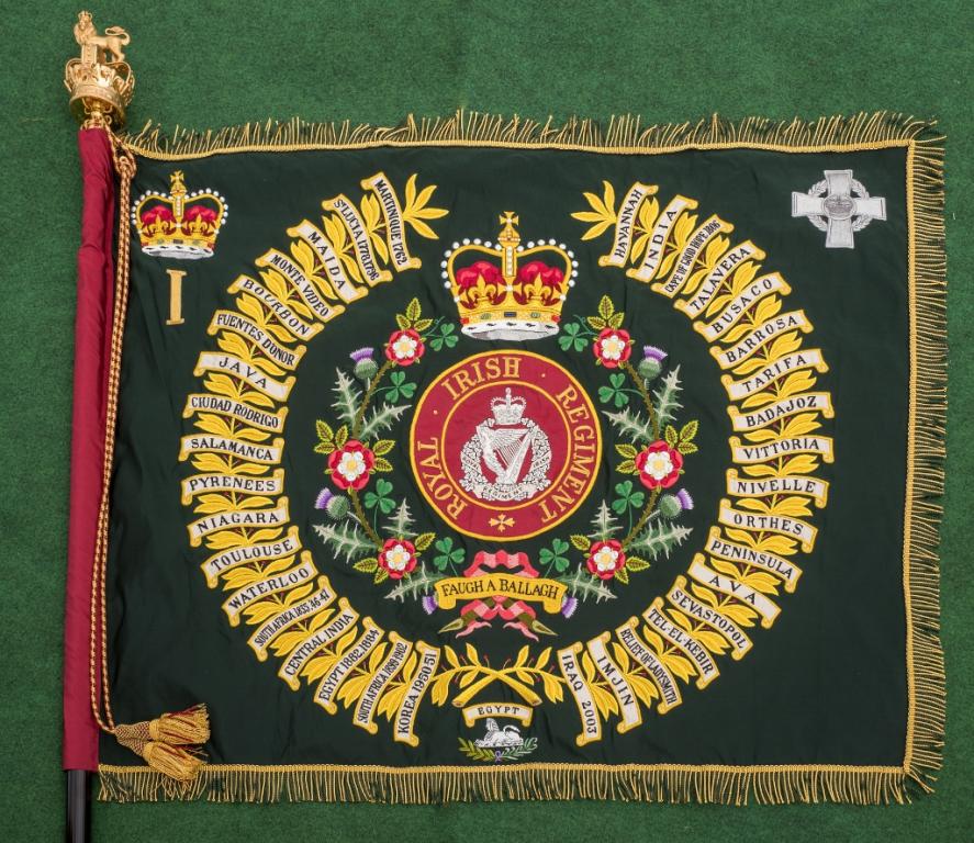 (You are invited to inspect the detail of our Colours by clicking on the images below. To learn more about what you see on our Colours and why Colours are important to us, please click on The Colours of The Royal Irish Regiment)