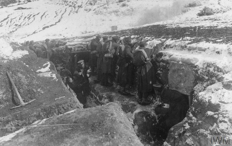 Bulgarian infantry in a front line trench in Macedonia, February 1917. Note a medical orderly helping a wounded soldier on the left.