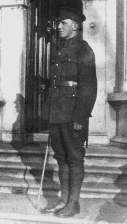 | Private William F McFadzean standing on the steps of his family home 'Rubicon' in the Cregagh area of Belfast. |