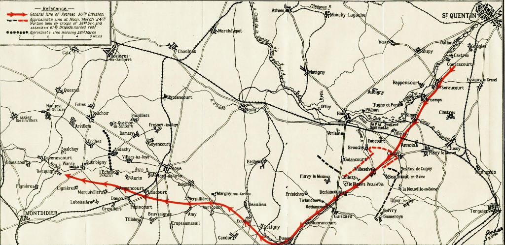 | Route of 36th (Ulster) Division during Retreat of March 1918. |